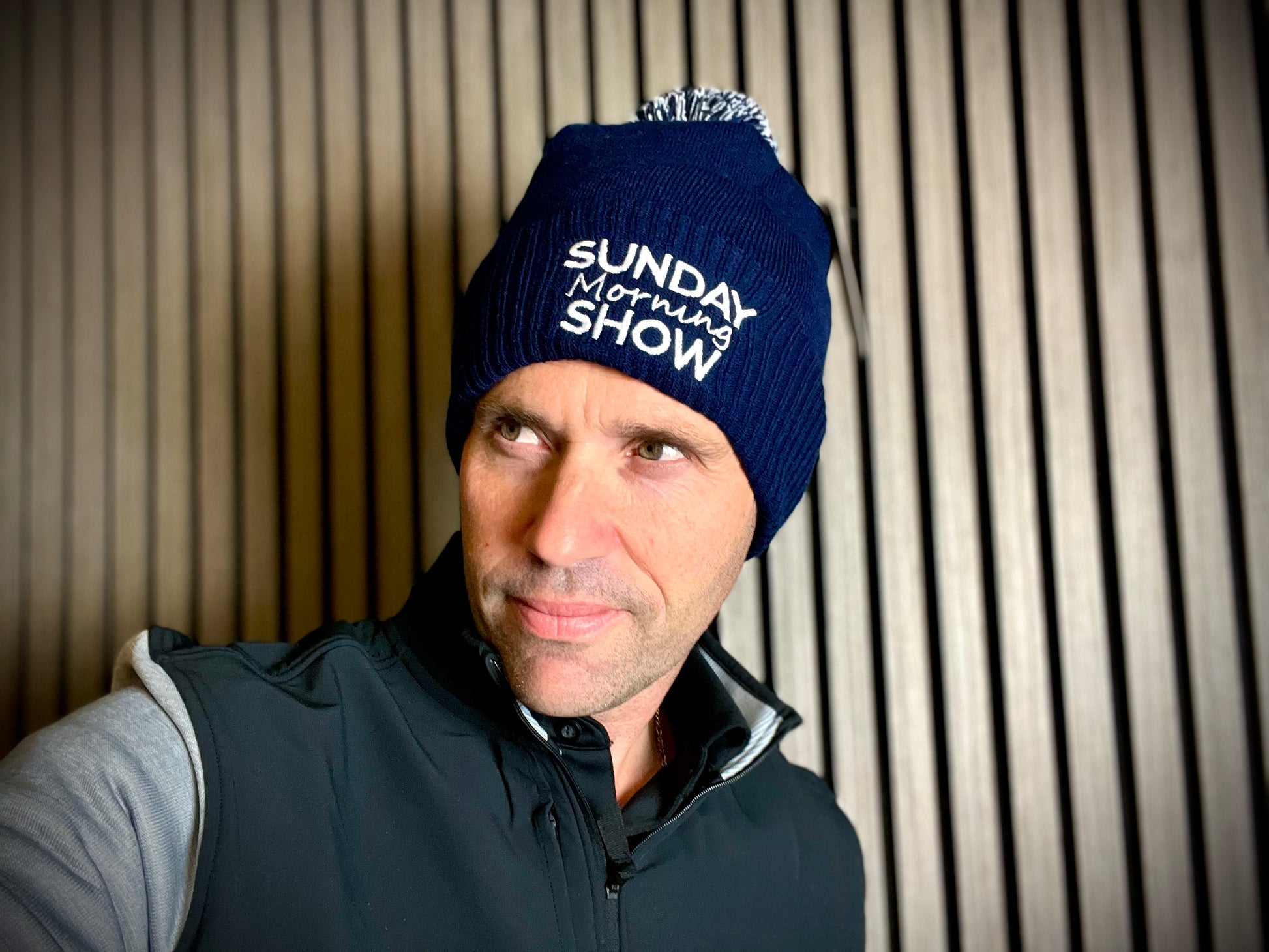The knitted beanie is made from 100% acrylic yarn and is designed with the signature Sunday Morning Show logo. One size fits all.
