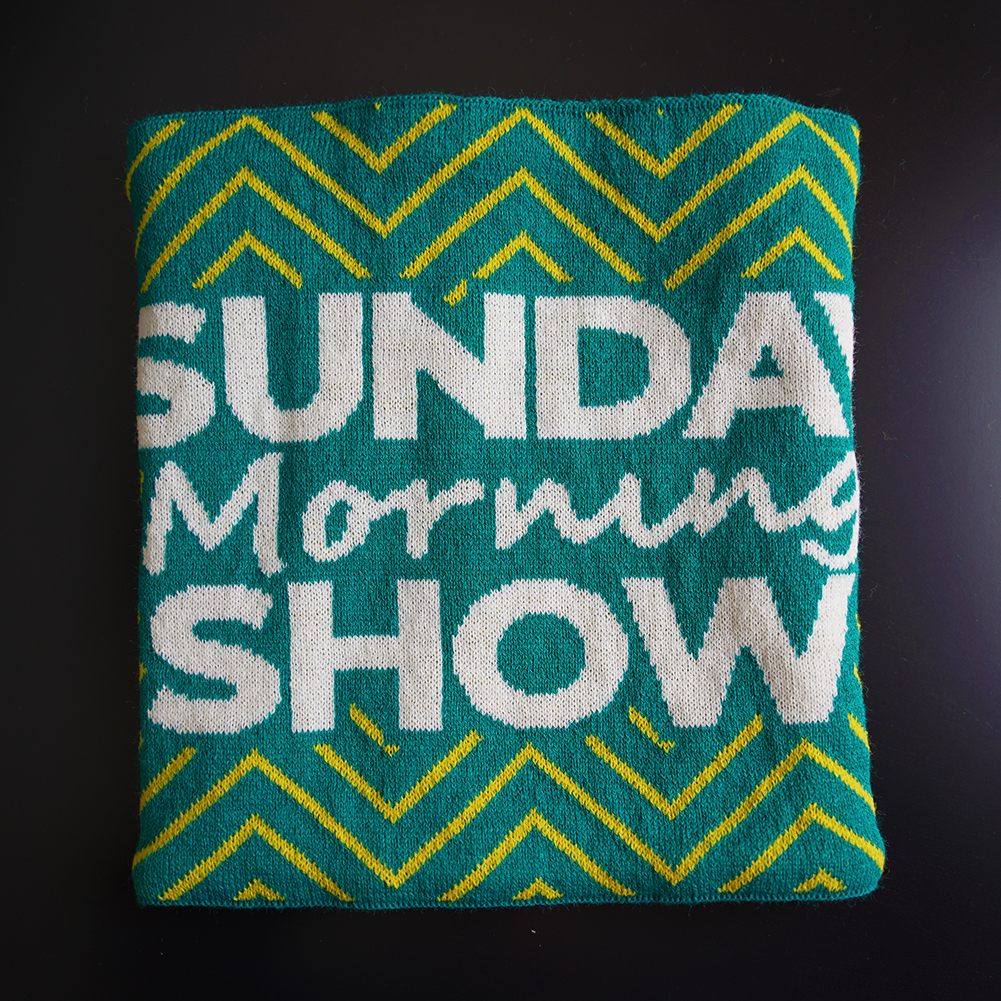 This snood is made from 100% acrylic yarn and is branded with the signature Sunday Morning Show colours and logo.