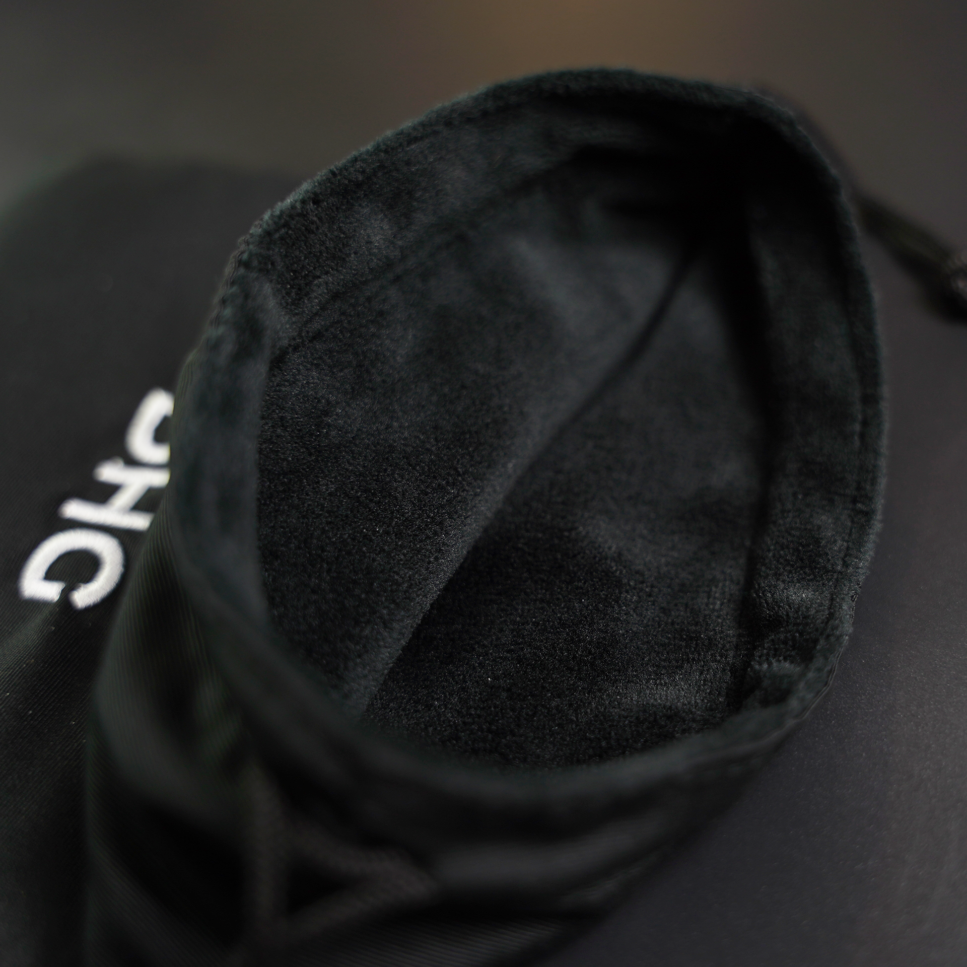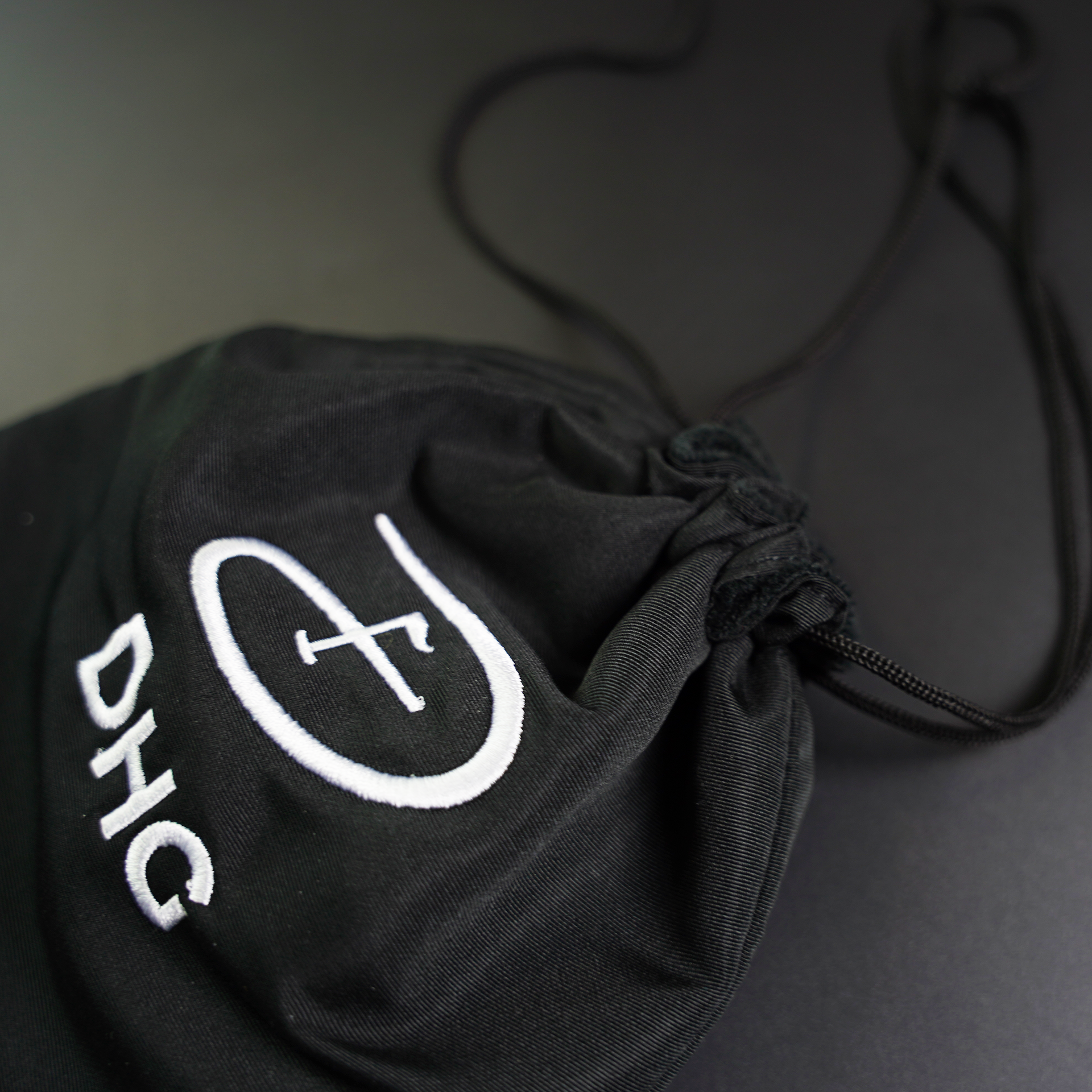 Black polyester pouch bag with embroidered DHG & SMS logos.